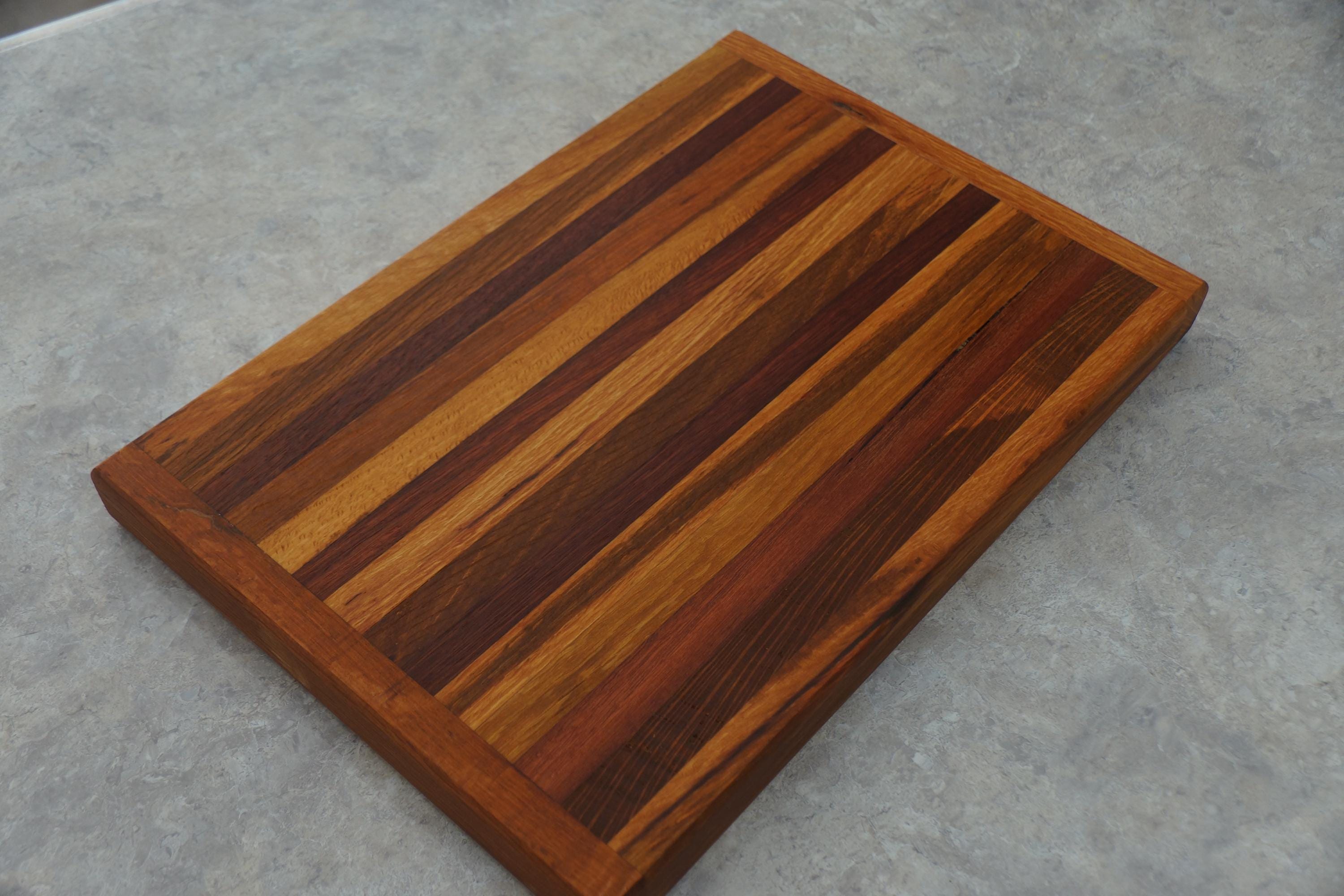 Mixed Timbers serving tray. Measures 425 x 295 x 35mm and weighs 5.5kg. Made from Jarrah, Marri, Tuart, Tasmanian Oak European Beech and She oak, this is a solid piece. Only one available. Finished with a food Safe oil. All splits and cracks in the wood have been filled with Epoxy Resin to give a safe smooth surface.