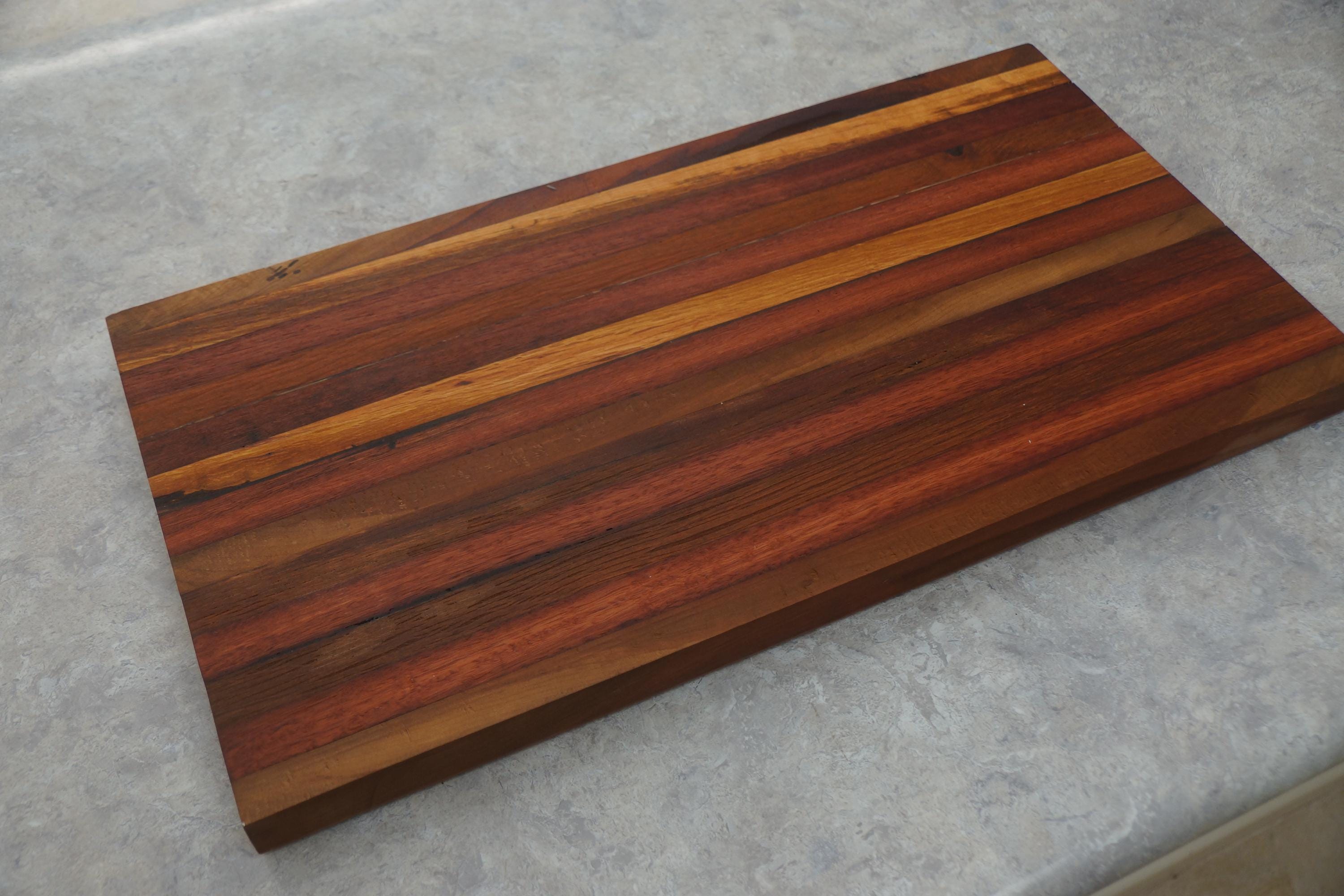 Mixed Timbers Kitchen Board with Juice Channel. Measures 540 x 290 x 30mm and weighs 7.1kg. Made from Jarrah, Marri, Tuart, Tasmanian Oak European Beech and She oak, this is a solid piece. Only one available. Finished with a food Safe oil. All splits and cracks in the wood have been filled with Epoxy Resin to give a safe smooth surface.
